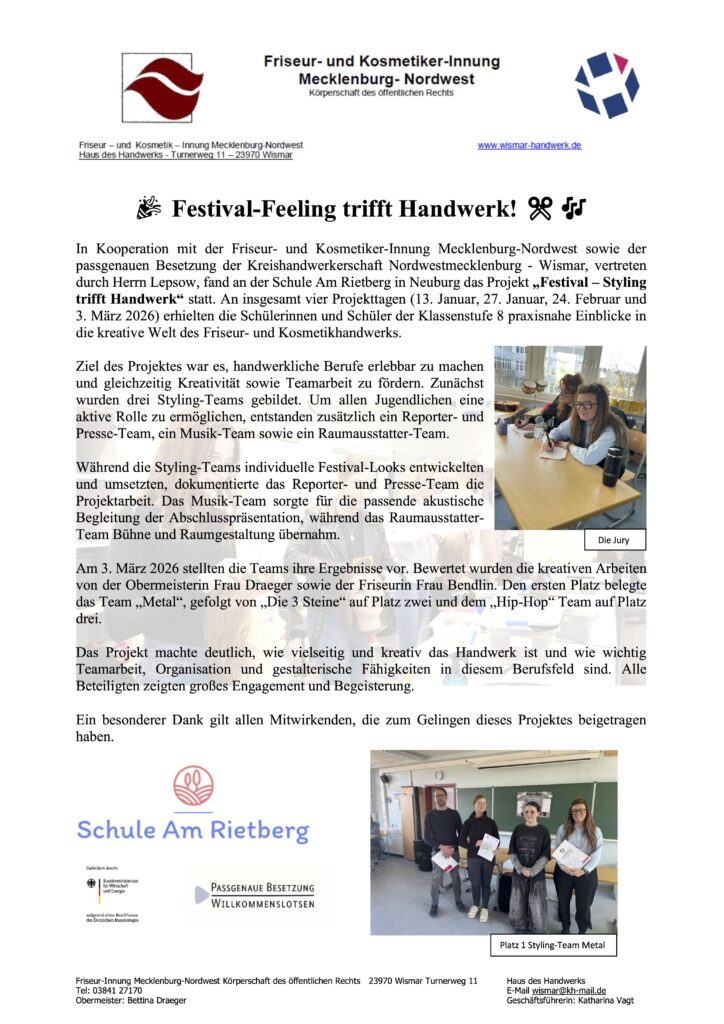 In Kooperation mit der Friseur- und Kosmetiker-Innung Mecklenburg-Nordwest sowie der passgenauen Besetzung der Kreishandwerkerschaft Nordwestmecklenburg – Wismar, vertreten durch Herrn Lepsow, fand an der Schule Am Rietberg in Neuburg das Projekt „Festival – Styling trifft Handwerk“ statt. An insgesamt vier Projekttagen (13. Januar, 27. Januar, 24. Februar und 3. März 2026) erhielten die Schülerinnen und Schüler der Klassenstufe 8 praxisnahe Einblicke in die kreative Welt des Friseur- und Kosmetikhandwerks.